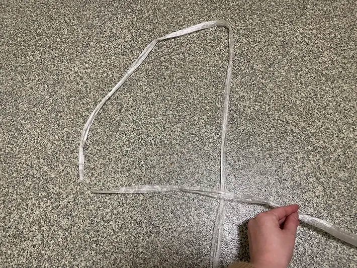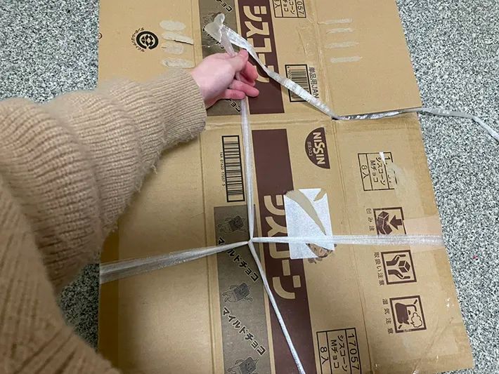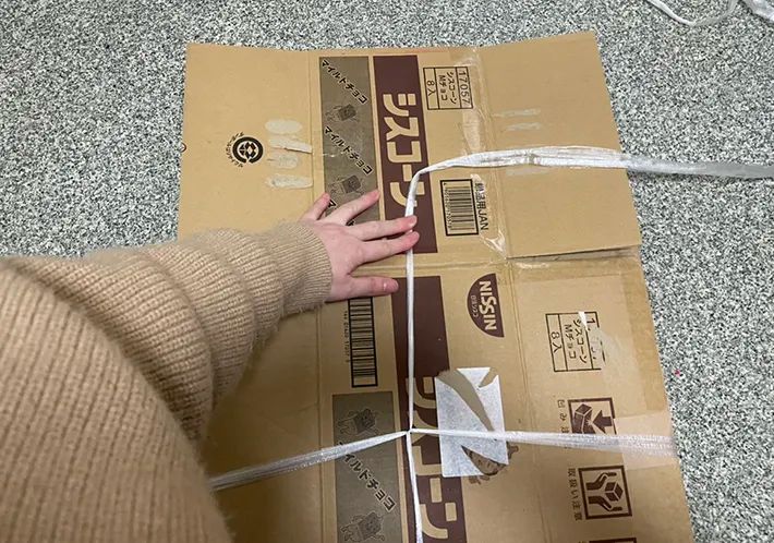 床の上に、ビニール紐を数字の『4』のように置いたら、ビニール紐が交差している部分にダンボールの中心がくるように重ねます。