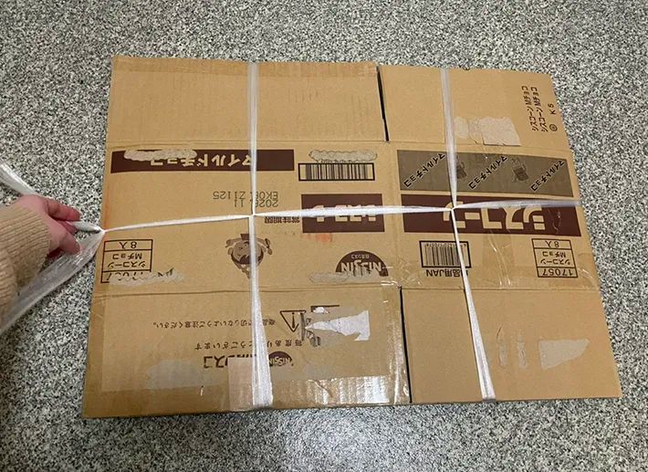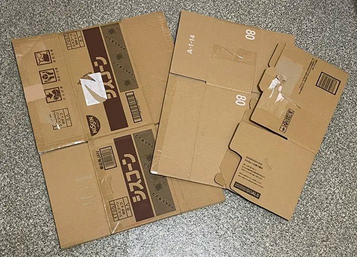 筆者が縛りたいダンボールは、全部で3つありました。サイズもバラバラで、ビニール紐がゆるむと、飛び出してしまいそうです。