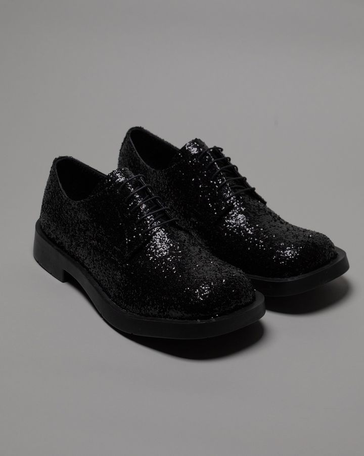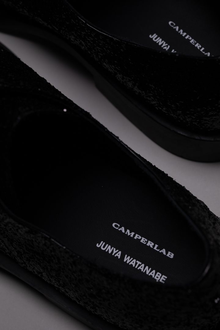 今回のウィメンズは、ジュンヤ ワタナベがカンペールラボの代表モデル「MIL 1978」をアレンジ。70年代の空気感をまとったクラシックなフォルムに、ぽってりしたボリュームが特徴の人気モデル。これをオールブラックでまとめ、アッパーからソールまで黒一色に染め上げる。さらに職人が一足ずつブラックグリッターをのせていて、控えめだけどしっかり存在感のある仕上がりに。極細のシューレースが上品さをプラスし、モードにもカジュアルにも振れる万能さにキュンとする。
