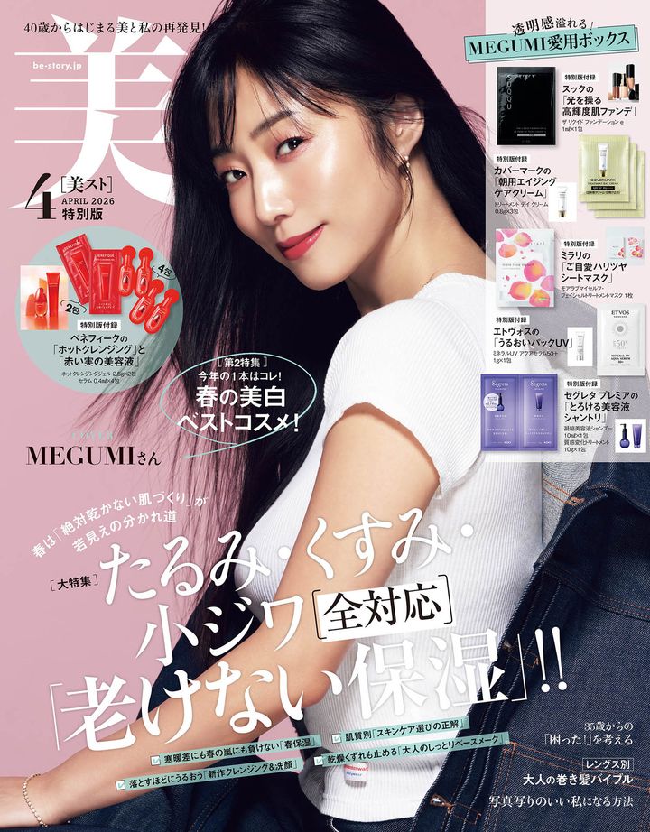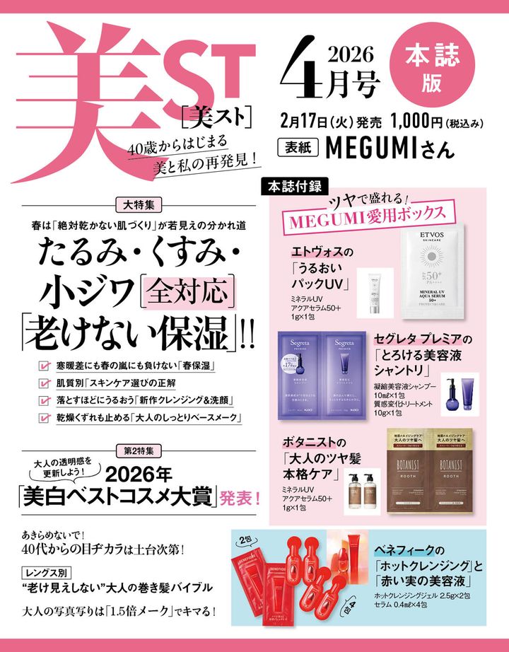 2月17日(火)発売・美ST2026年4月号のネット書店予約がスタートしました!MEGUMIさん&佐野勇斗さん(M!LK)が表紙を飾ります。佐野勇斗さんは美ST初表紙!共通付録はベネフィークのホットクレンジングと赤い実の美容液。さらに本誌と特別版はMEGUMIさんの愛用アイテムが詰まった「MEGUMI BOX」が付録に!そして、増刊にはアクアレーベルの「進化系オールインワン」たっぷりサイズが付録につきます!完売必至につき、お早めにご予約ください!