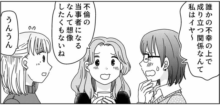 私はチナツ。久々にカフェで集まった私たち3人。ヤエちゃんの不倫話を聞いて、その手口の巧妙さに驚いてしまいました。不倫をしたい人間にとっては、そこまでの手段をとってでも守りたい関係だったのでしょう。私には理解が及びませんが……。家族PCでのやりとりや下書き利用は、まさに「灯台下暗し」ですね。すると今度はイロハちゃんが、ママ友からされた衝撃的な告白を話しはじめました。「実は不倫している」と直接聞かされたらしく、私たち2人は絶句。普段の様子からは想像もつかないカミングアウトに、イロハちゃんも顔が引きつったそうです。