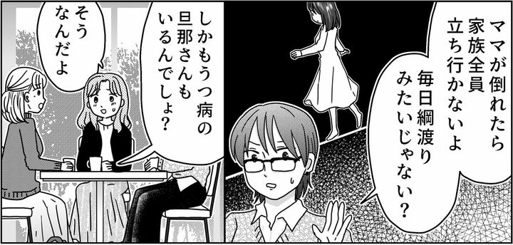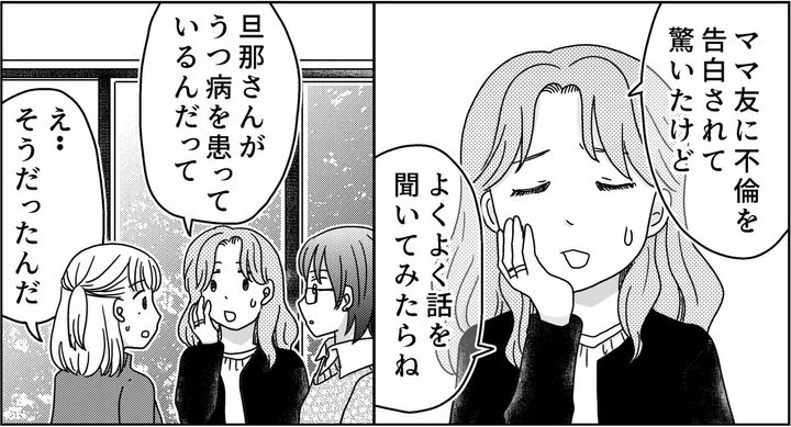 「私としてはいきなり不倫の告白をされたわけだからさ、正直すごく動揺したんだけど」しかし……そのママ友の話をよく聞いてみると、なんと旦那さんがうつ病を患っているそうなのです。そのため、ママ友は仕事も育児も家事もとにかく全部ひとりでこなしていると。心身ともに相当辛いだろうなと想像できます。