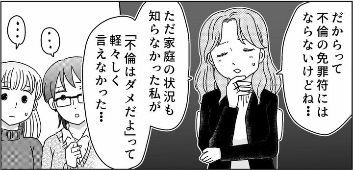 イロハちゃんは、そのママ友の話を聞けば聞くほど「いろいろと辛くなって道を踏み外しちゃったのかな?」とも思ったそう。もちろん、不倫の免罪符にはならないけれど。私たちのあいだに、またもやしばしの沈黙が訪れました。先ほどの巧妙手口の不倫話とは違って、それぞれの表情には複雑な感情が広がっていました。