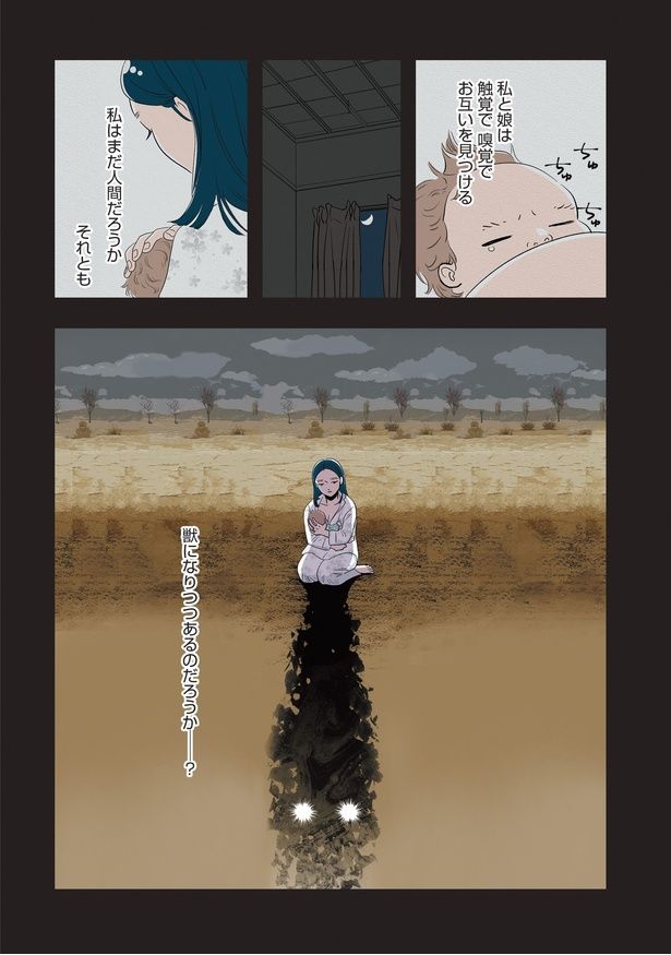 余裕なく子育てに追われる母親像は、自分とはかけ離れていて、玲奈は自分がそんな母親になるはずがないと思っていた。しかし、初めての胎動を感じた時、臨月で眠れなくなった時…刻一刻と「その日」に向けて自分の体が変わっていくのを実感する。「母親になる」、それは「獣になる」ということ――? 産後も以前と変わらないと周囲は言うが、玲奈の中には大きな変化が起こっていて…。朱野帰子さんの珠玉の怪談短編集を漫画化した『くらやみガールズトーク』。いよいよ第3巻が2月6日に発売! 堂々完結を迎える最終3巻のエピソードをお届けします。