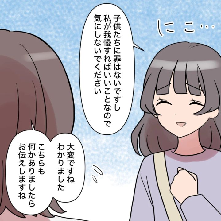 田中さんは「子供たちに罪はないですし、私が我慢すればいいことなので気にしないでください」と笑顔を作って見せると、先生は「大変ですね。わかりました。こちらも何かありましたらお伝えしますね」と困惑気味に答えました。
