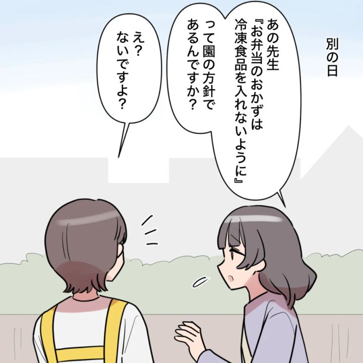 別の日、田中さんは困惑した様子で「あの、先生。『お弁当のおかずは冷凍食品を入れないように』って園の方針であるんですか?」と先生に尋ねました。保育園にそんな方針はないため、先生は「え?ないですよ?」ときょとんとして答えます。