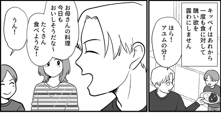 キッペイが継続して頑張ってくれているのが見ていてもわかります。そして離婚話から1年後。きっとかなり努力してくれているのでしょう。キッペイはあれから一度も食に対して醜い欲を露わにしません。今のキッペイは、真っ先に自分の分をとるのではなく、まずはアユムや私の配膳をしてくれます。