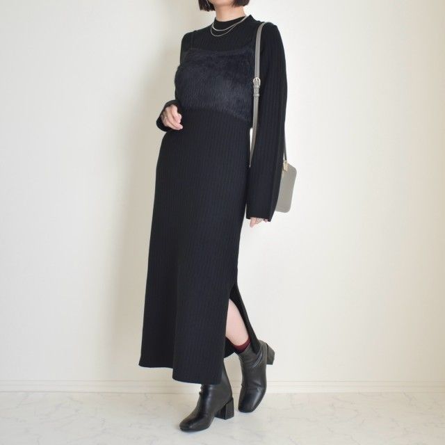 Iラインのブラックニットロングワンピースはまさしくぴったり。見た目にもきちんと感があって、お出かけらしいコーデに決まります。