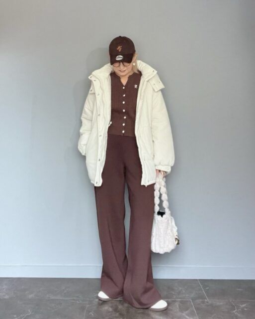 そこでおすすめなのがスウェットパンツを取り入れたダークブラウンコーデ。白のアウター&小物を合わせてバイカラーに仕上げれば、おしゃれ感も抜群な着こなしに仕上がります。