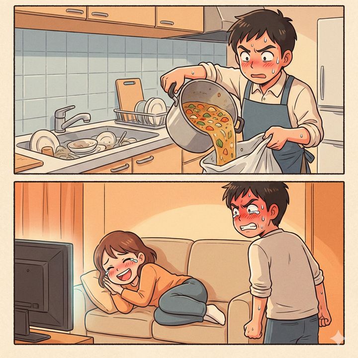 「もったいない!節約して作ってよ!」と料理に文句を言う妻。俺が洗ってる鍋を見ても、同じことが言えるのだろうか…