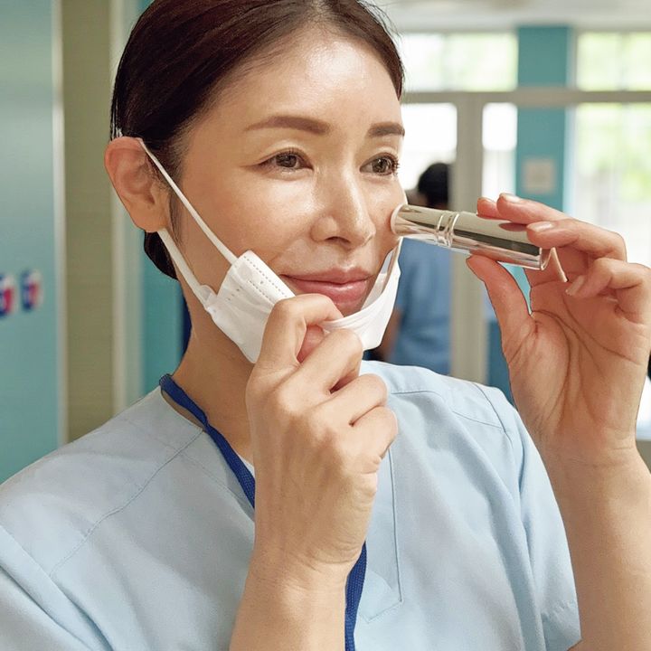 Tゾーンはテカるのに、目元や頰は乾燥しがちな混合肌。仕事柄、冷暖房の影響でどうしても肌が乾燥してしまうため、可能な限り、肌に水分と油分を補うようにしています。水分補給はコンパクトな化粧水ミスト、油分補給はスティック状美容液で、どちらも持ち運びできるサイズにして、バッグやポケットに常備。仕事中も欠かさずケアしています。“水分×油分”をバランス良くプラスすることで、かさつきやテカリのない健やかな肌になれるんです。