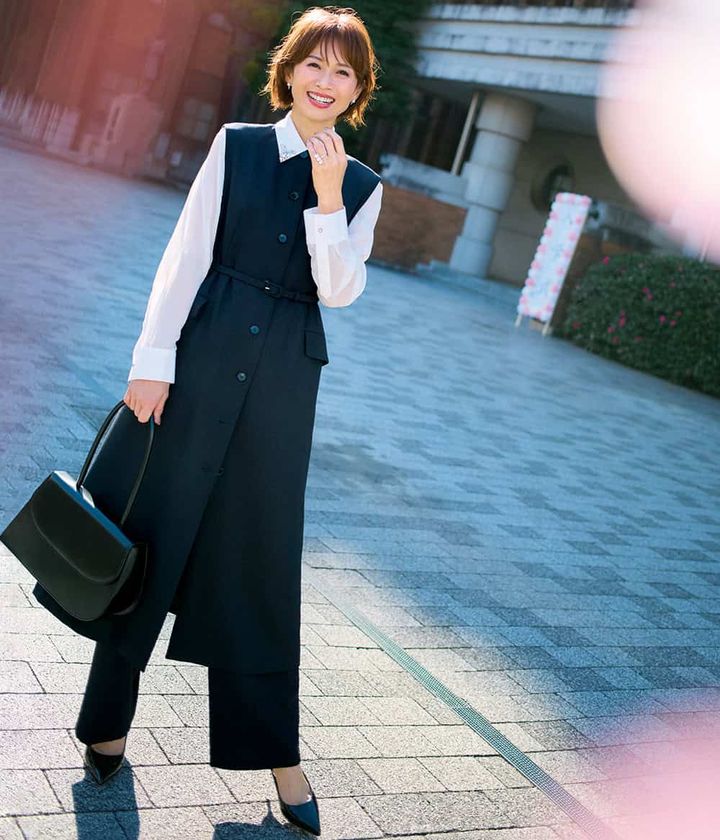 流行に左右されない定番アイテムこそ鮮度の高さがオシャレの印象に直結。映えに頼らずとも信頼を築ける。そんなセットアップが大人の賢い選択。長め丈がスタイリッシュなジレは近寄りがたくならないように、ビジューの白衿で優しげな好感度コーデに。