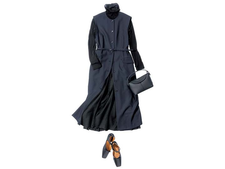 式典に相応しいオールブラックで。おめでたい場で重たい印象にならないようインナーにはシアー素材で抜け感を。ジレの下を開けてエレガントなニットのスカートをのぞかせれば、目立ちすぎず、さりげなく華やぎのあるスタイリングに。