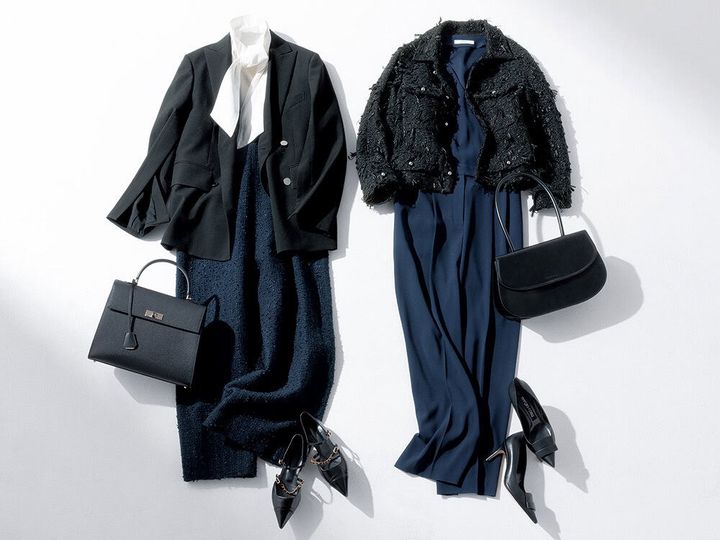 袖の開きで洒落感と抜け感が出るジャケット。ファンシーツイードのオールインワンで柔らかさをプラス。黒×紺の色合わせはスタイリストも推し。ジャケット¥110,000(ハイク/ボウルズ)ツイードオールインワン¥59,400(ルル・ウィルビー/アルアバイル)ブラウス¥30,800 (イロット/ザ・ウォール ショールーム)バッグ¥297,000(ボナベンチュラ)シューズ¥53,900 (サロンデジュ/バロックジャパンリミテッド)
