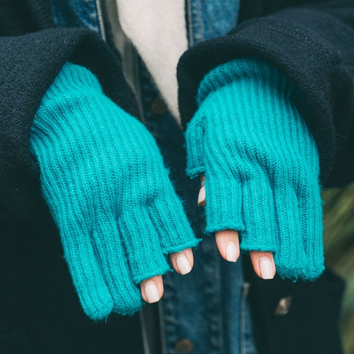 鮮やかなターコイズグリーンの手袋で挿し色をプラス! フィンガーレスのデザインもこなれた雰囲気で、小物使いの上手さが光る。