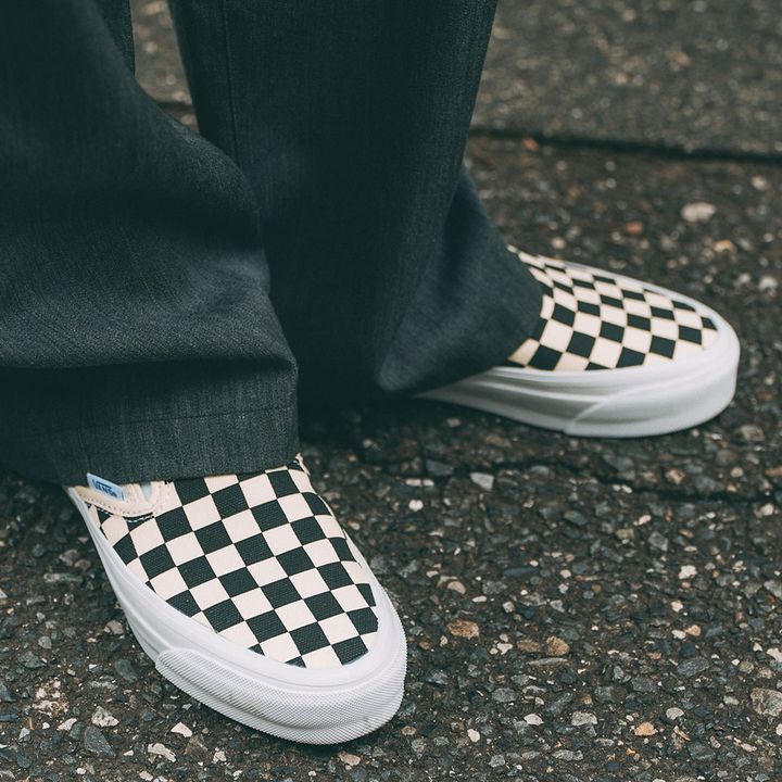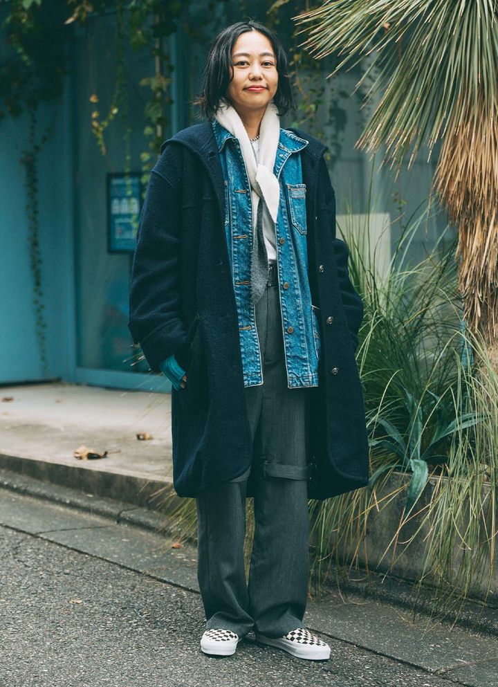 足元のチェッカー柄でアクセントを取ったのがグッド! ほっこりしがちな冬コーデにメリハリがつくアイテム。