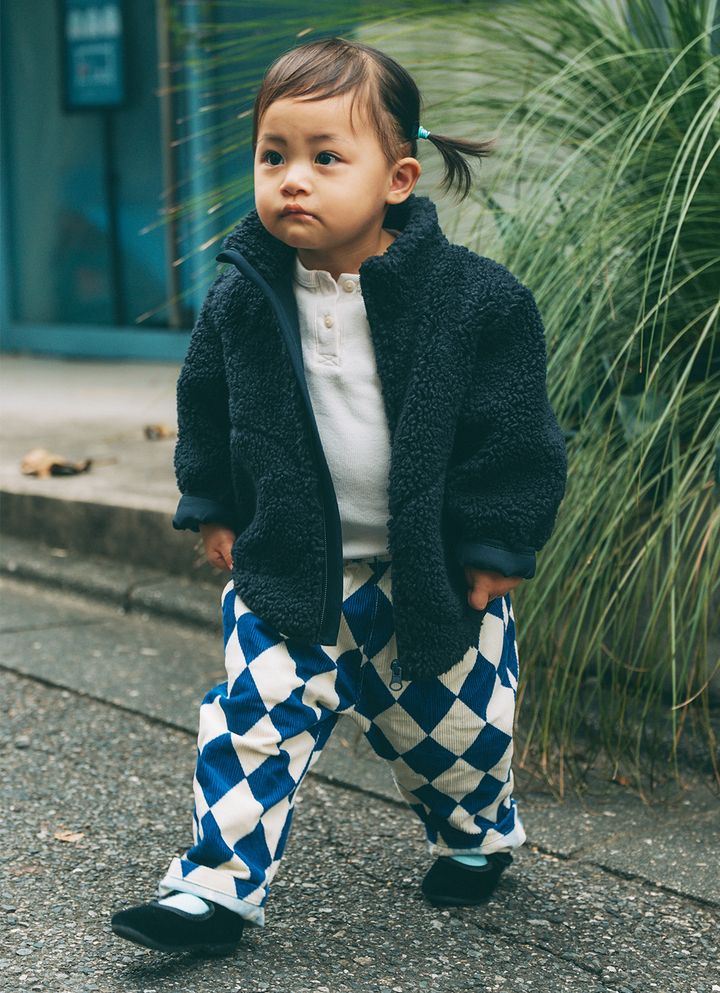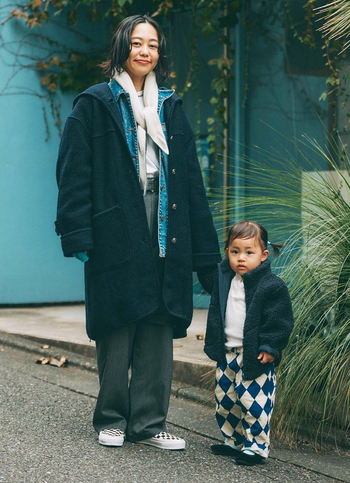 マンネリしがちな冬コーデを、異素材のレイヤードや小物で新鮮に魅せるママコーデがおしゃれ! ママが好きなダイヤ柄とキッズが好きなブルーをシェアして、親子でのおしゃれが一層楽しくなるリンクコーデの完成♪