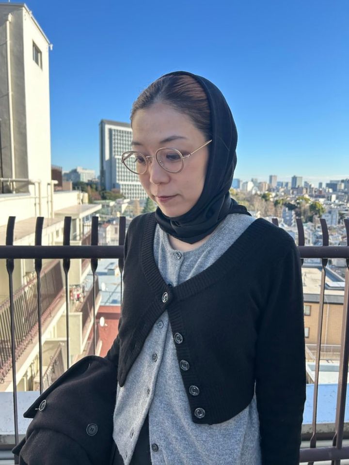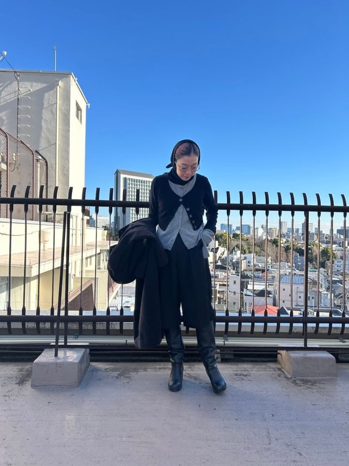 「コートとスカーフは、母からのお下がり。寒い日は大判のスカーフを頭まで巻いて使うことが多いです。折りたたむと小さくなるので、冬のバッグにはいつも入れています。Meryll Roggeのニットは凝ったデザインがお気に入りで、着用率高め。ZARAのロングブーツは、ボリューム感がちょうどよく、ハーフ丈ボトムとも相性がいいんです」(会社経営・原田美和さん)