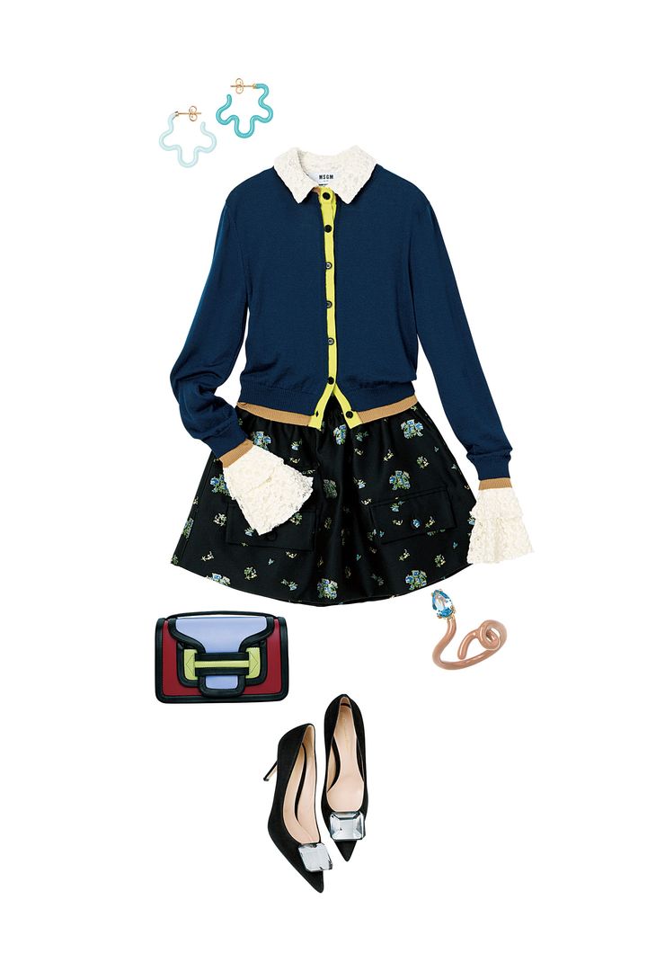 カーディガン¥75,900 ブラウス¥84,700(2点共エムエスジーエム/アオイ) スカート¥44,000(バウム・ウンド・ヘルガーテン/エスアンドティ) バッグ¥157,300(ピエール アルディ/ピエール アルディ 東京) 靴¥181,500(ジャンヴィト ロッシ/ジャンヴィト ロッシ ジャパン) ピアス¥77,280 リング¥92,720(2点共ベア ボンジャスカ/ベア ボンジャスカ カスタマーケア)