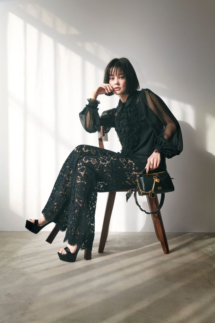 ソリッドな印象になりがちなオールブラックも、レースやシフォンの質感を味方につければこんなにも華やか。首の詰まった丸襟ブラウスにフルレングスのパンツで全身を覆うストイックな一面と、その半面レーシーなパンツで大胆に肌を見せた潔さがアンビバレントな魅力を醸して。