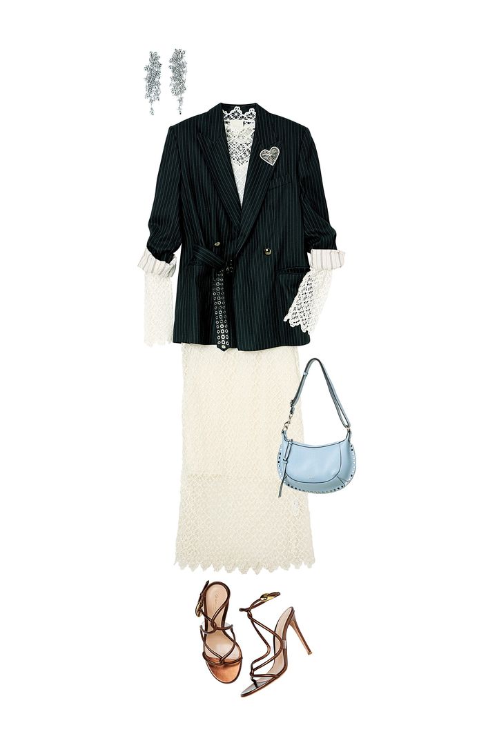 ナチュラルなムードも感じさせるレースワンピースは、白ならより自然体で着こなせます。ロマンチックなフルレングス丈のワンピースをシティな印象に寄せる辛口なストライプジャケットを合わせれば、お仕事シーンにも対応。小ぶりなバッグやヌーディなサンダルをチョイスし、レースの軽やかさを生かすのがポイント。