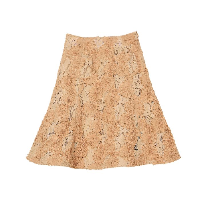 レースの上からシフォンで花を描いたクチュール感が素敵。軽やかに広がるシルエットやパッチポケットがガーリーな要素をプラス。