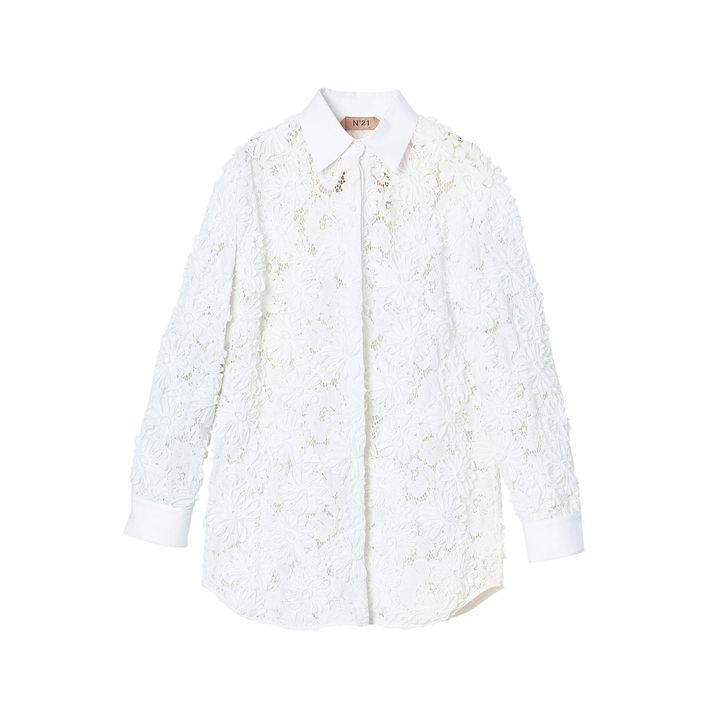 シュリンクした風合いのレース生地が体にフィットし、重ね着しやすい襟付きシャツ。小花柄の刺繍を施したミニスカートや小物で色を散らせて心弾むコーディネートに。