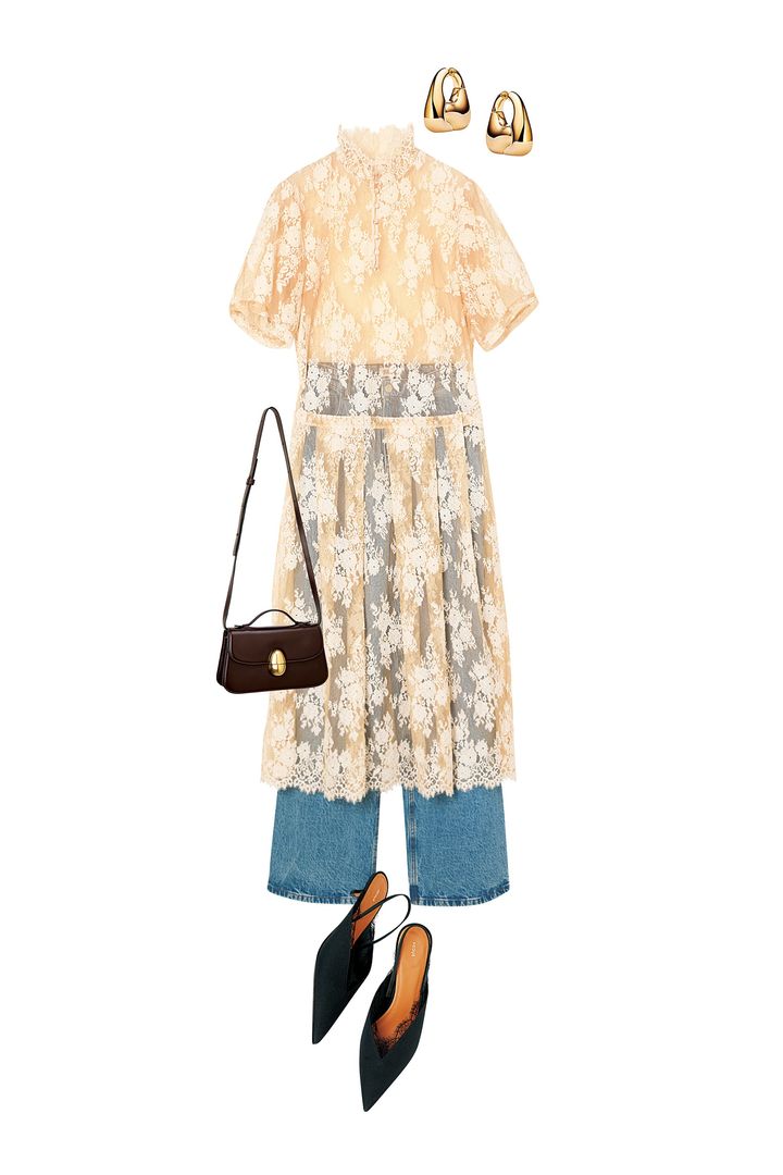 インナーを入れず、あえて中のコーディネートを透けさせる着こなしは昨今のトレンド。長め丈、太いシルエット同士を重ねてリラクシーな雰囲気を漂わせて。ゴールドが効いたピアスやバッグ、シャープなポインテッドトゥのミュールと小物でエッジをプラスして。