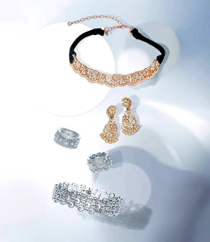 メゾンのオートクチュールやファブリックを再解釈して生まれたまとうように身につけるジュエリーは、ディオールならではのクリエイション。金糸でビジューを絡め取り編み上げるリュネビル刺繍さながらの金細工のパーツとベルベットのリボンがシームレスにつながるチョーカー。レースが耳元でたゆたうイヤリングをセットで着用すれば社交界の圧倒的な主役に。ネックレス[PG×ダイヤモンド]¥13,500,000 イヤリング[PG×ダイヤモンド]¥7,200,000(2点共ディオール ファイン ジュエリー/クリスチャン ディオール)