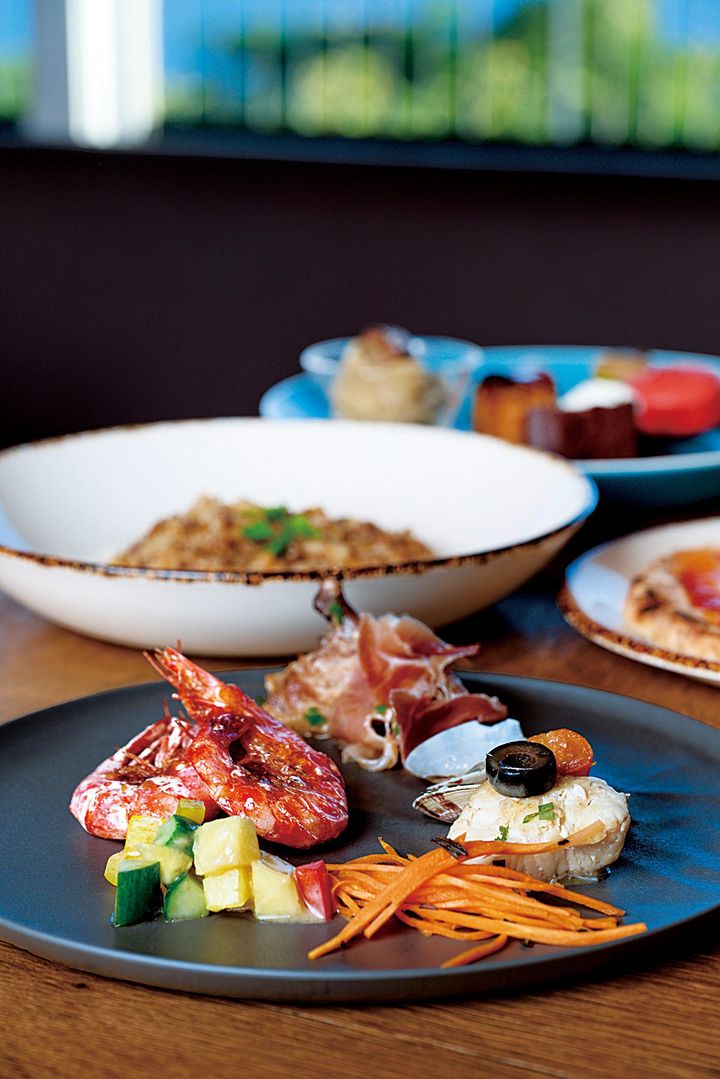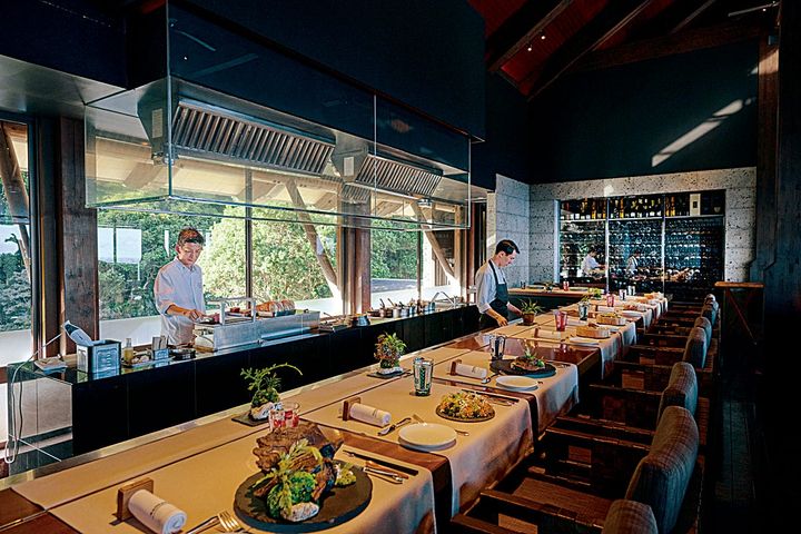 シェフが目の前で仕上げるライブキッチンを備える「The View(ザ・ビュー)」。地元の生産者から仕入れた食材を生かしたビュッフェスタイルの料理を絶景と共に。 (C) HIROSHI ABE