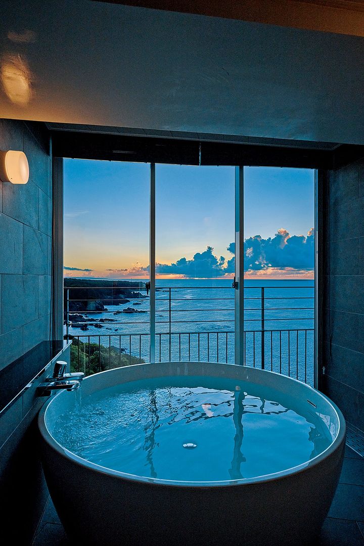 好きな時間に天然かけ流し温泉を部屋で味わうためには、ぜひ「温泉スイート」を。どの部屋からでも見事な景観を味わうことができます。「samana・温泉スイート」 1泊2食付き 1名¥64,500~(サ込み) (C) HIROSHI ABE