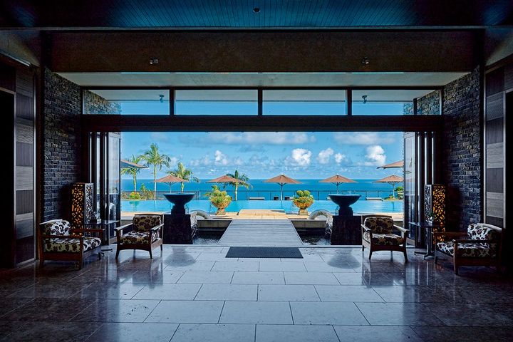 ホテルに入ると、まず目に入るのが、正面のインフィニティプール。高台に位置するため、プール越しに飛び込んでくる大海原のパノラマに心が奪われます。それは文字どおり「恵み」を感じる瞬間。 (C) HIROSHI ABE