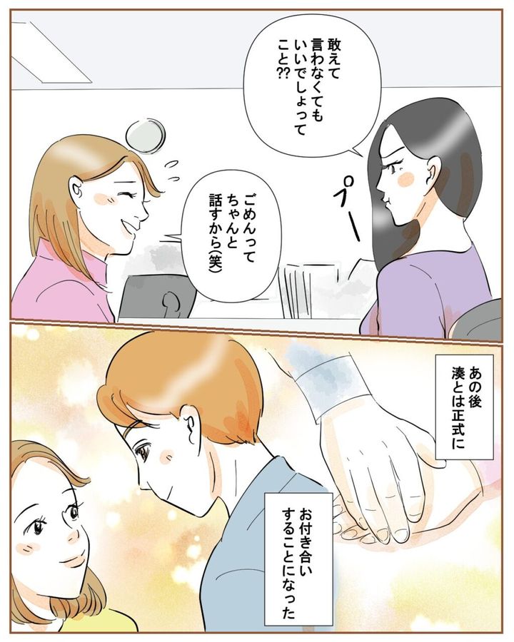 夫和也さんが新入社員ほなみさんと不倫し離婚することになった美香さんは、突然のことでショックを受けたものの同期の麗子さんたちに励まされ徐々に元気に。その後、仕事のサポートについた後輩男性佐藤さんのことが少しずつ気になるようになりました。その頃和也さんから復縁を迫られるようになった美香さんを守ろうと佐藤さんは美香さんを家まで送るように。和也さんからの脅しのようなメッセージだけでなく、ほなみさんには「和也さんはもういらない」「邪魔するな」と怒りのメッセージが届いた美香さん。ある日仕事帰り突然「クソババァ!」と言ってほなみさんが飛び掛かってきました。何とか無事だったものの驚いていると、謝り出す佐藤さん