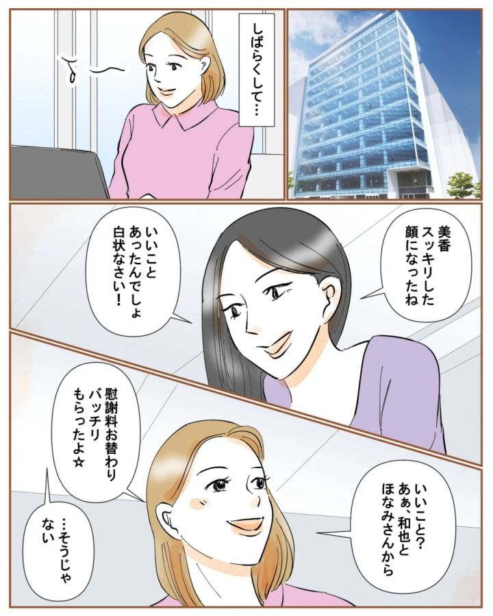 実は佐藤さんの友人ユウマさんが婚約破棄したほなみさんの相手だったのです。その後和也さんからの狂気じみたメッセージを見て「すぐ相談しましょうよ。美香さんに何かあったら・・」と口走り焦る佐藤さんに慰謝料のおかわりをすると強がる美香さん。すると佐藤さんが「美香さんのことずっと守らせてください」と告白。佐藤さんの温もりを感じ、美香さんの瞳から自然に涙がこぼれました。