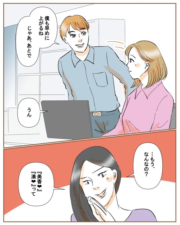 「僕も早めに上がるね。じゃあ後で」「うん」そんな会話をして湊が行ってしまうと、「・・もう、なんなの?『美香』『湊』って」と途端にニンマリ顔になる麗子は、