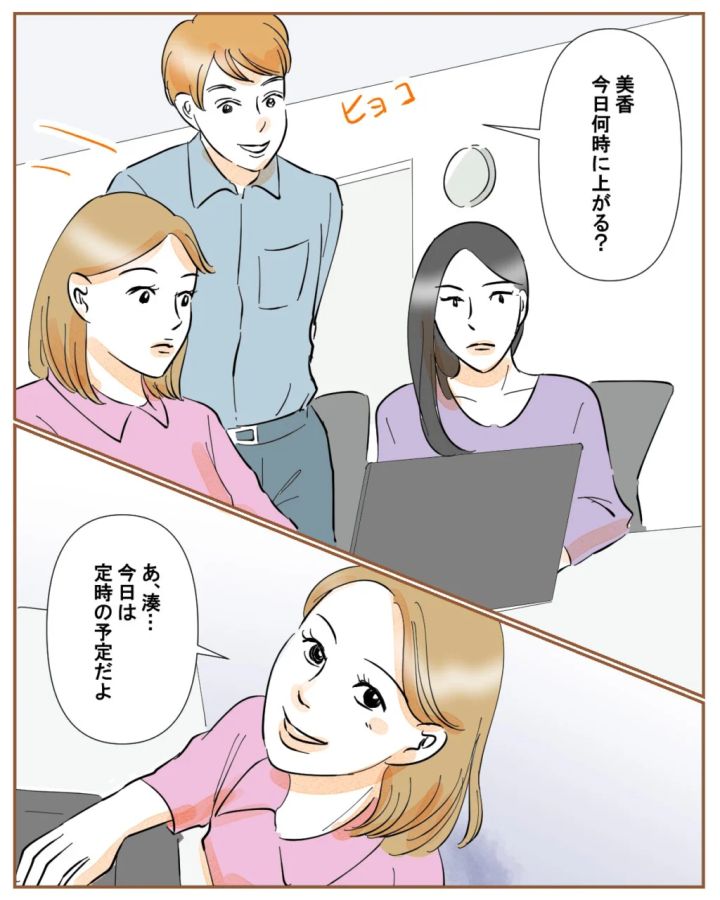 するとそこに「美香今日何時に上がる?」そう言ってやって来た湊。麗子の顔には「え?美香?」という驚きの表情が(笑)それもスルーしたまま「あ、湊・・今日は定時の予定だよ」と湊を見上げながら答える私に、