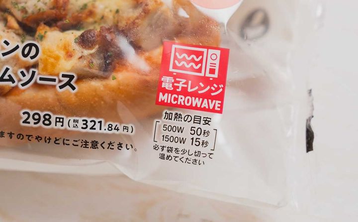 本商品は“温めて食べる”タイプなので、パッケージには加熱の目安が書かれています。電子レンジ500Wの場合は50秒、1500Wの場合は15秒です。