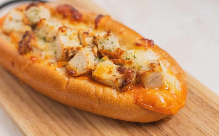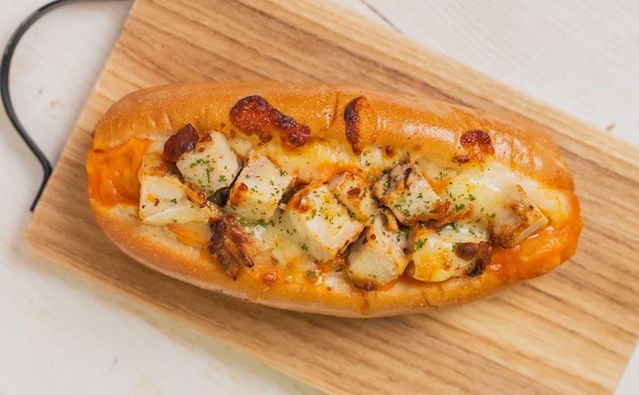パンの真ん中に切れ目が入っていて、ソースと具材がたっぷりとサンドされています。