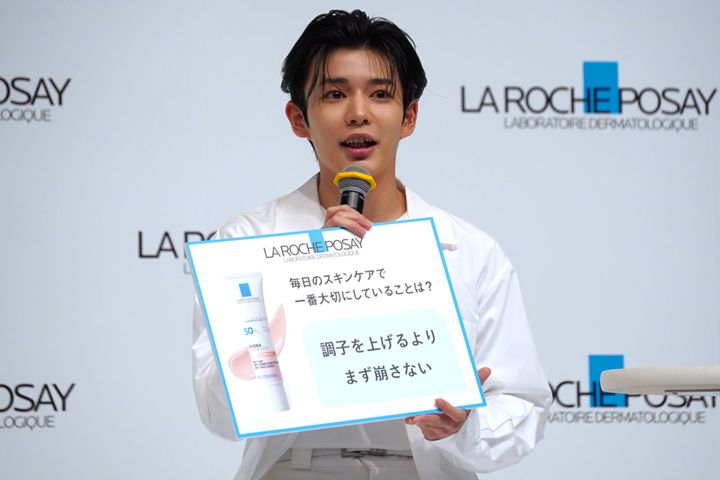「映画とかで特殊メイクとかをすることがよくあるんですけど、その期間に肌が荒れてしまったりすることもあって。その時にラ ロッシュ ポゼさんの製品をたくさん使わせていただいていたので、普段使っている製品のアンバサダーになれたことがすごくうれしく、僕も皆さんに使ってくださいって言いやすいなと感じております」と、アンバサダー就任の喜びを語りました。