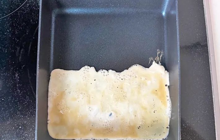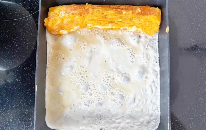 再び、卵白を流し入れます。今度は玉子焼き器全体に流し入れてください。