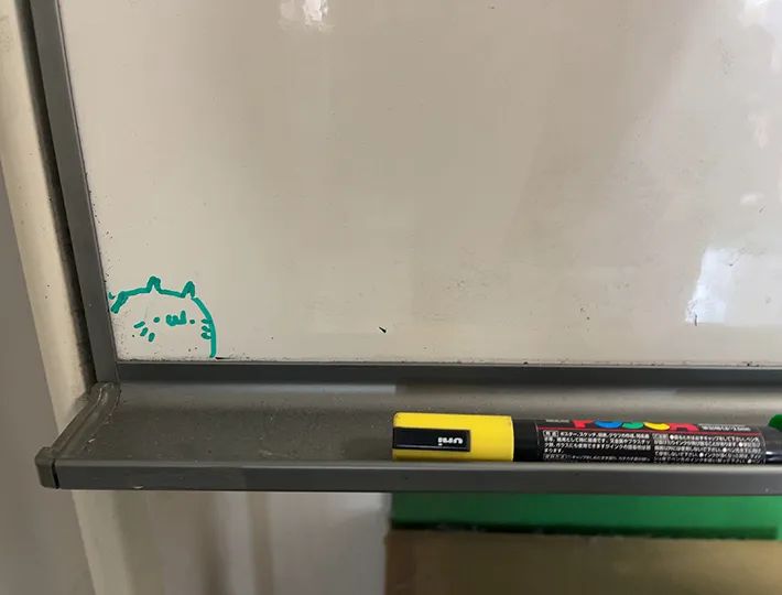 ホワイトボードの隅っこに描かれたのは、かわいい猫のイラスト!
