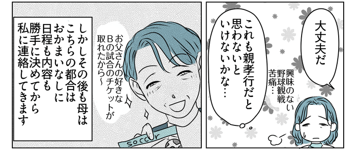 正直苦痛な時間ではありますが、これも親孝行と思うしかないのでしょう。しかしその後も、母が勝手に取ったチケットを私に押し付けてきます。