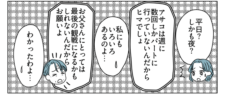 私(アサコ、40代)は夫(タツヤ、40代)と中学生、小学生の子どもとの4人暮らし。近所に私の実家があり、父(ゴロウ、70代)と母(ユキエ、60代)が住んでいます。父はガンを患っていますが、元々寡黙な人だからかあまり家族に体の状態を話そうとしません。一方の母はおしゃべり好きな人。母は私が子どもの頃からフルタイムパートで働き続けており、父のガンの転移がわかってからはいつも以上に忙しそうにしています。