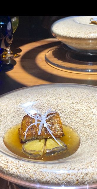 器選びで思わず舌を巻いたのが、煮物料理「星の砂漠」です。料理は、散りばめられた星の砂をモチーフにした、鰻の蒲焼と鮑の揚げ出し豆腐。これから体験する人に驚きを味わってもらいたいので、ここでは詳しい説明は控えますが、料理長のアイデアに脱帽した一皿です。