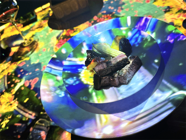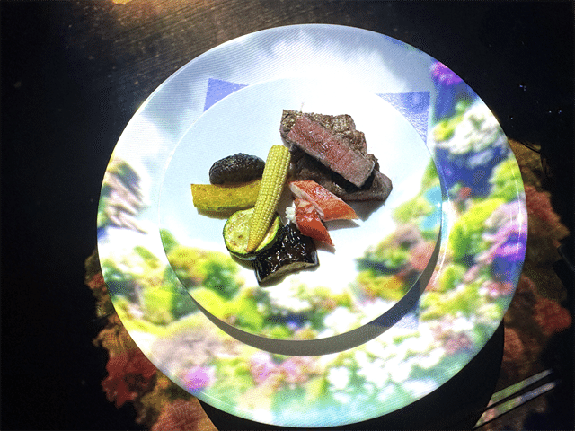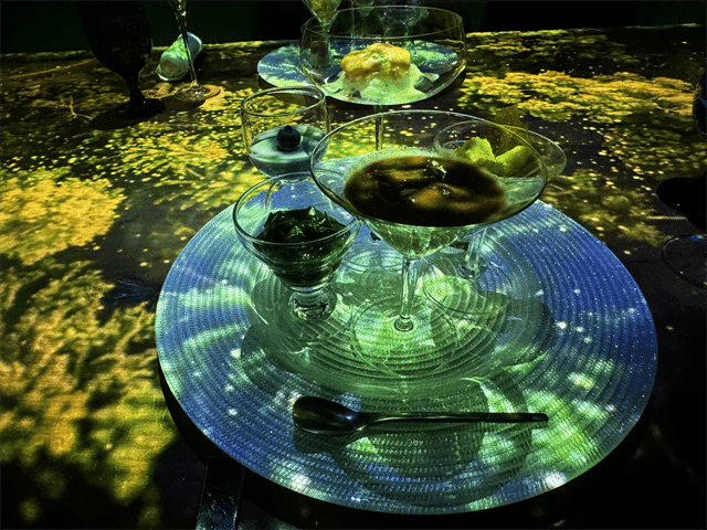 壁面だけでなく、テーブルに映し出される映像も必見。前菜の一皿とテーブルが草木で彩られ、とても華やかです。この後の料理にも期待感が高まります。