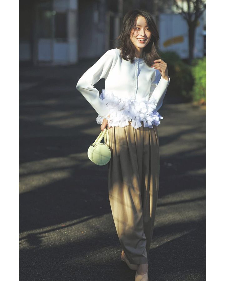 ブラウス¥19,140(ブラン)パンツ¥39,600(サードマガジン)ジャケット¥35,200(アルページュストーリー/アルページュストーリー プレスルーム)バッグ¥31,900(トゥティエ)ピアス¥132,000(ウノアエレ/ウノアエレ ジャパン)