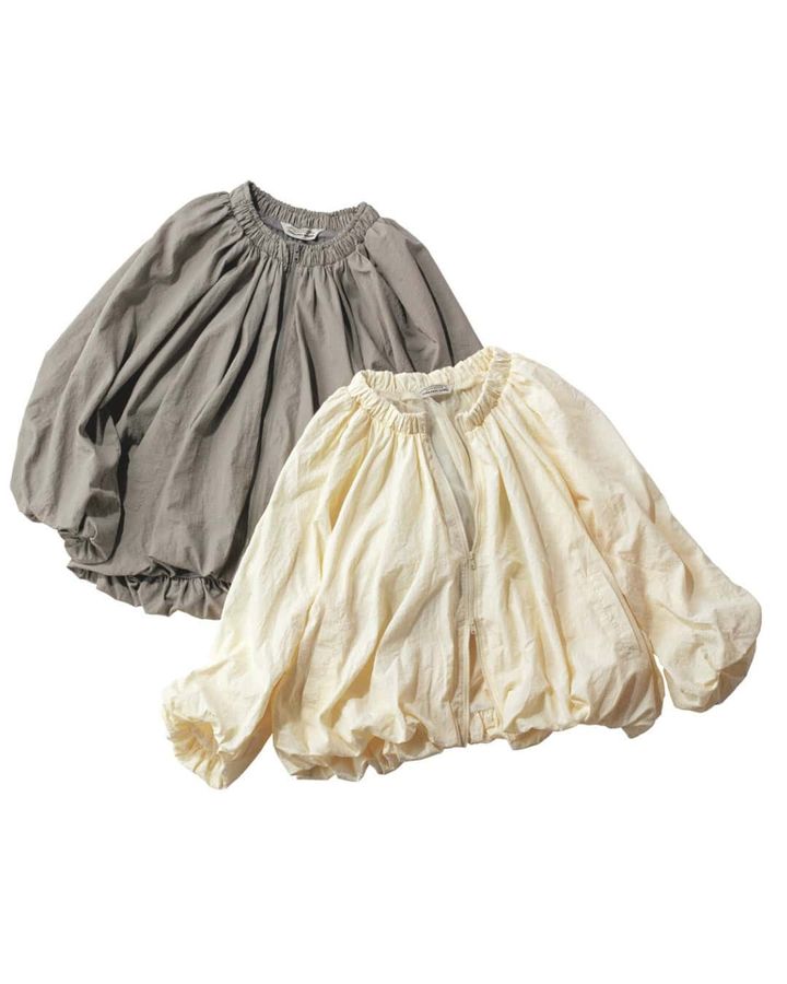 袖口と、裾がバルーンになったブルゾンは、撥水素材を使用。裏地は軽やかなメッシュ素材なので、初夏まで涼しく着られます。1枚でブラウスのように着ることもでき、着こなしの幅が広がります。