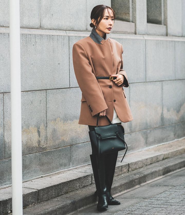 「RECTOのジャケットはECで購入。流行でもある肩幅広めのマニッシュなデザインは、ウエストマークすることで華奢な体型にも馴染みます」(大川内朋美さん 38歳・フリーモデル、PR)