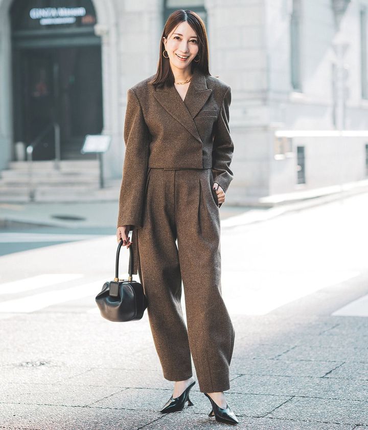 「このセットアップのクロップド丈のジャケットは、纏うだけでモードな印象を演出し脚長効果も発揮。肩の程よい幅感もポイントです。パンツは裾のベルトでシルエットが変えられるのも魅力。167cmの私には絞った方がバランスが取りやすい」(赤枝紗貴さん 45歳・パーソナルスタイリスト)