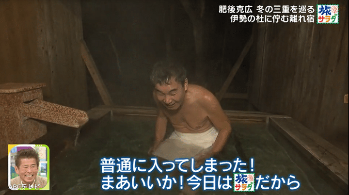 バスタオル1枚の姿になった肥後は、湯に手を突っ込んだ瞬間に「アッチ、アッチ!」と大騒ぎ! しかしすぐに、「……42度。さっき聞きました。ちょうど適温です」と明かして浴槽へ。そして、うっかりとした表情で、「しまった……普通に入ってしまった! まあいいか、今日は旅サラダだから!」と呟いた。